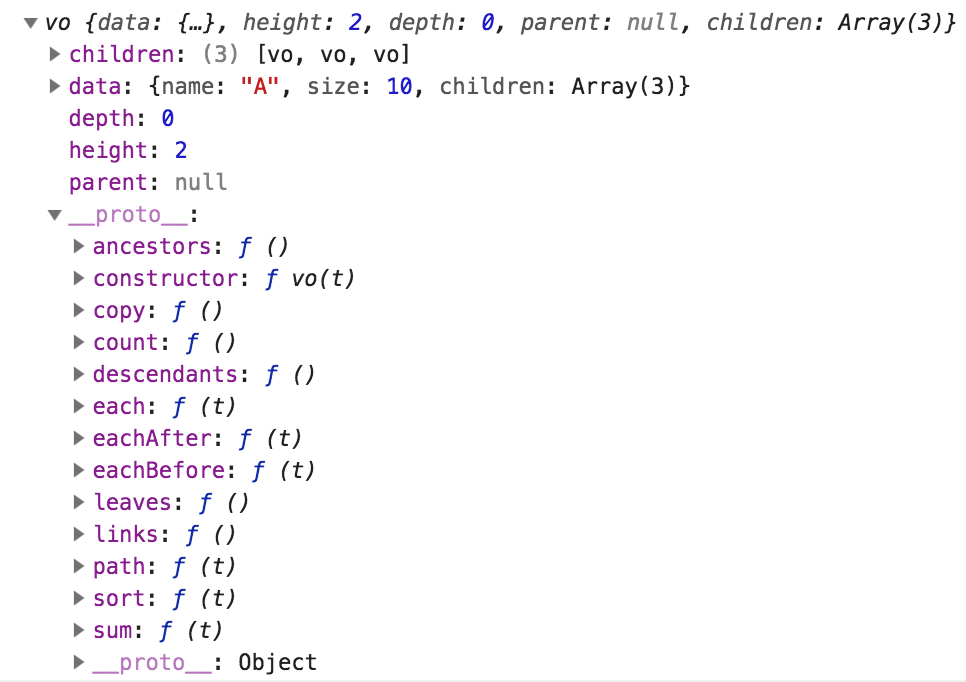 We show in the screenshot below the root node as returned by d3.hierarchy.